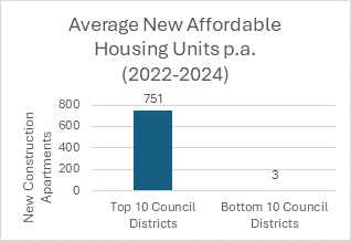 One of the core causes of this spiraling housing crisis is a lack of housing production. In recent decades, New York has built far less housing than is needed to keep up with demand to live in the city, driving gentrification, displacement, segregation, and tenant harassment. At the same time, while some neighborhoods have seen transformative levels of growth, others have added scarcely any new housing. From 2014 to 2024, just 12 Community Districts added as much housing as the other 47 combined. That uneven production helps explain why, despite the City's commitment to fair housing, integration, and anti-discrimination policies, the New York metropolitan area remains among the most racially segregated in the country.