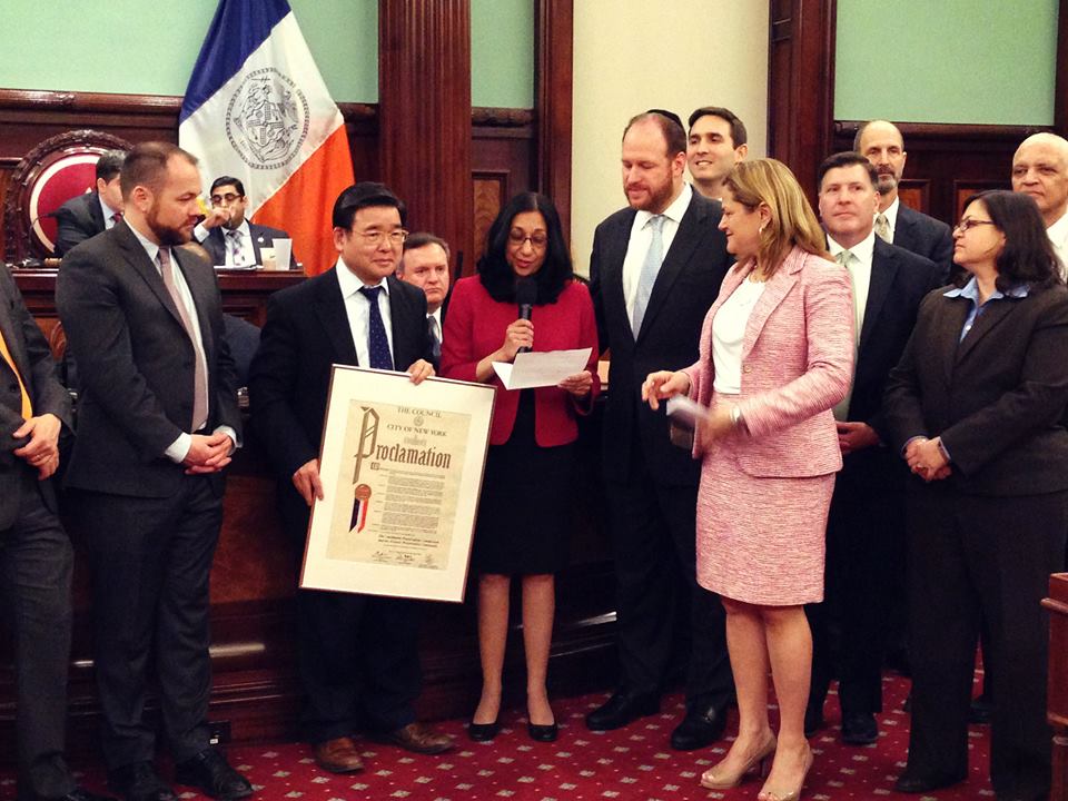 On April 16, 2015, Speaker Melissa Mark-Viverito and the New York City Council presented Landmark Preservation Commission Chair Meenakshi Srinivasan with a proclamation honoring the 50th anniversary of the Landmarks Law, the Landmarks Preservation Commission, and the preservation community. Chair Srinivasan accepted the award on behalf of the agency, Commissioners, and preservation advocates, many of whom were present for the proclamation ceremony. We thank the City Council leadership and members for their longstanding support of the Commission and its work.