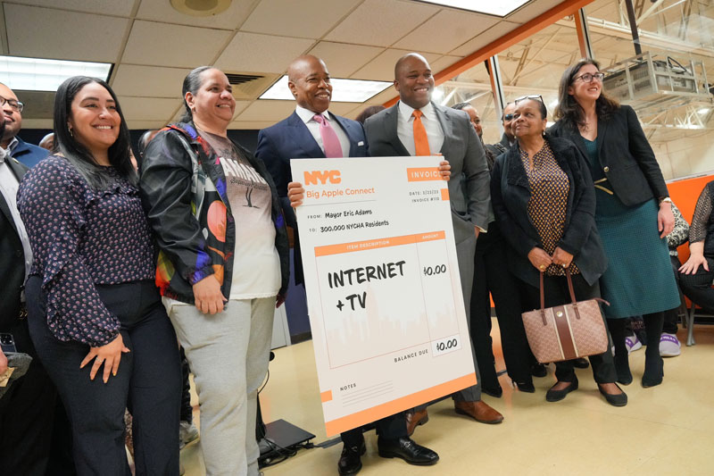NEW YORK – New York City Mayor Eric Adams and Chief Technology Officer and New York City Office of Technology and Innovation (OTI) Commissioner Matthew Fraser today announced the expansion of ‘Big Apple Connect’ — the nation’s largest municipal broadband program — by nearly 50 percent, providing free internet and basic cable television service to a total of 202 New York City Housing Authority (NYCHA) developments, and reaching approximately 300,000 New Yorkers. OTI has now expanded ‘Big Apple Connect’ to an additional 67 NYCHA developments since last year, reaching up to 40,000 new households — ahead of schedule after announced at the full launch last fall when Mayor Adams promised to install ‘Big Apple Connect’ in more than 200 NYCHA developments by the end of 2023.