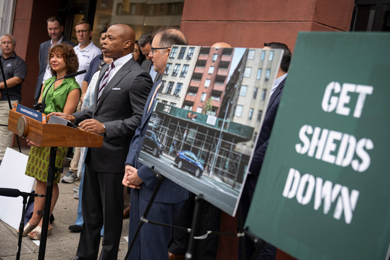 NEW YORK – New York City Mayor Eric Adams and New York City Department of Buildings (DOB) Commissioner Jimmy Oddo today unveiled “Get Sheds Down,” a sweeping overhaul of rules governing sidewalk construction sheds and scaffolding that will remove these eyesores from city streets more quickly while redesigning and reimagining those that are needed. These sheds, sometimes called scaffolding, can be a blight on public spaces and foster illegal activity. The “Get Sheds Down” plan will improve public safety and quality of life by removing them more quickly and replacing them, where possible, with more aesthetic or less intrusive alternatives, like safety netting, that keeps New Yorkers safe without creating blight in public space.