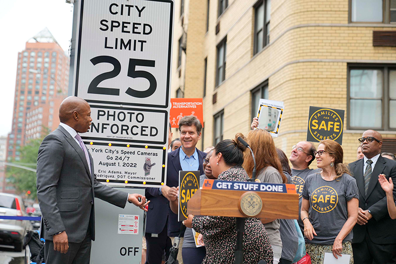 New York – New York City Mayor Eric Adams today flipped a ceremonial switch to mark the expansion of the city's speed camera program that will help keep New Yorkers safe around the clock. Beginning tonight, the city's 2,000 speed cameras in 750 school zones citywide will operate 24/7 for the first time. Throughout July, the New York City Department of Transportation (DOT), the New York City Police Department (NYPD), the New York City Taxi and Limousine Commission (TLC), the New York City Department of Citywide Administrative Services (DCAS), and other agencies and offices in the city's Vision Zero Task Force led a multimedia, multilingual public awareness campaign to inform drivers of the coming change and remind them to drive safely and responsibly. Speed cameras and automated traffic enforcement are proven tools that prevent dangerous behavior and crashes, reducing speeding by 72 percent on average.