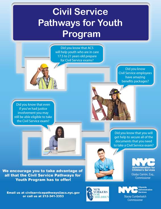 The Civil Service Pathways Youth Program sponsored by ACS, the NYC Department of Citywide Administrative Services (DCAS) and New Yorkers for Children can help you apply for public service jobs and prepare for exams that are required for certain jobs.