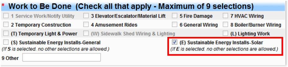 A licensed electrician must file an electronic application online to obtain the electrical work permit. Box ‘E’ of the ED16A form should always be checked (see below) to ensure qualified inspectors are assigned to the project.