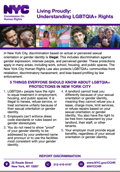 In New York City, discrimination based on actual or perceived sexual orientation or gender identity is illegal. This includes discrimination against gender expression, intersex people, and perceived gender. These protections apply in many areas, including work, school, housing, and public spaces. The New York City Human Rights Law also protects LGBTQIA+ communities from retaliation, discriminatory harassment, and bias-based profiling by law enforcement.