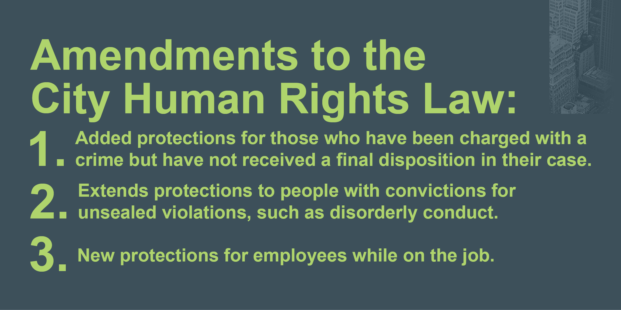 In July 2021, amendments to the City Human Rights Law went into effect that protect even more New Yorkers with criminal records from job discrimination. In conjunction with these amendments, the Commission renewed its public education effort on the Fair Chance Employment Act through the strategic use of paid social media advertising, Google search targeting, and Google display ads. The Commission also partnered with organizations like The Legal Aid Society, Neighborhood Defender Services of Harlem, the Bronx Defenders, and Legal Services NYC to distribute a new guide for workers on criminal history protections.