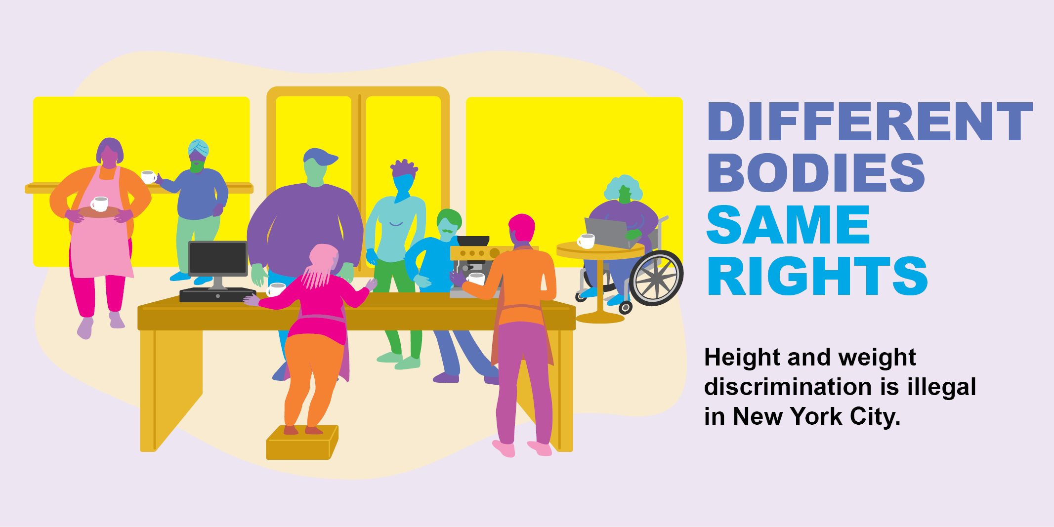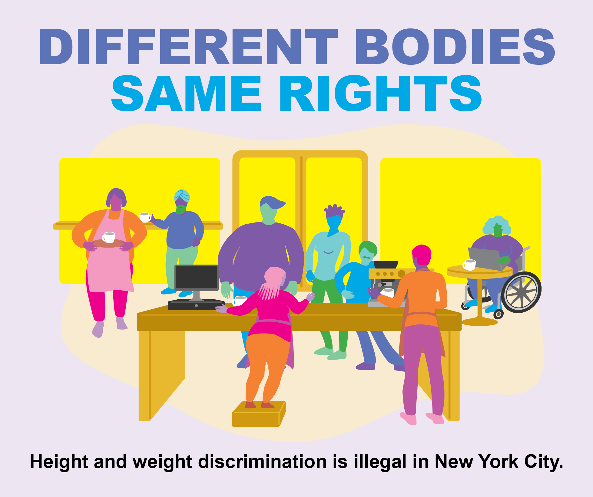 The NYCHRL’s workplace protections extend to many groups of workers, including interns and independent contractors. Height and weight protections apply to applicants and individuals that are employed. There are limited circumstances where height, weight, or body size criteria may be taken into account in employment, described in the workplace section below.