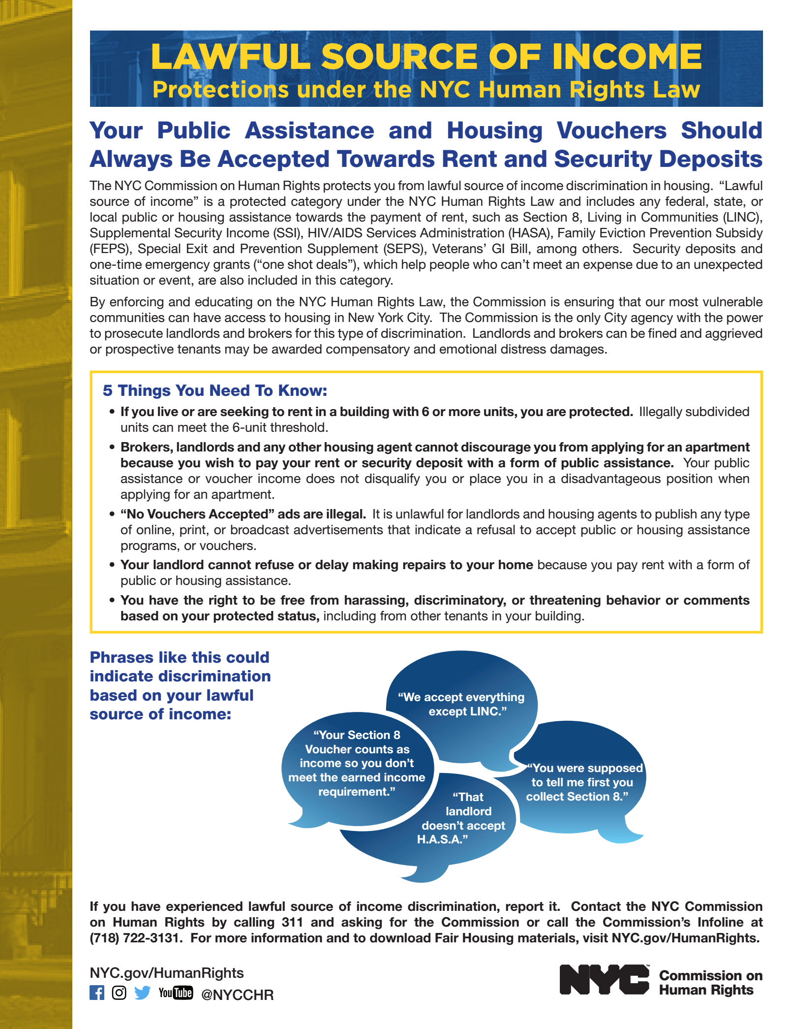 All New Yorkers deserve to have equal access to housing, employment, and public places. Our factsheets give a snapshot of rights and responsibilities under the NYC Human Rights Law.