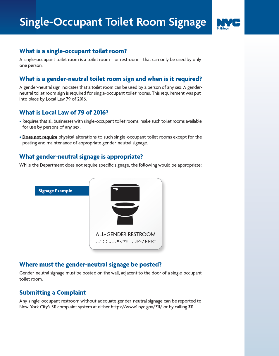 By law, businesses must make single-occupant bathrooms available for persons of any gender. A sign must be posted near the bathroom's entrance indicating that it is open to all genders.