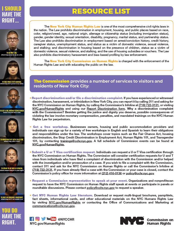 Commission Resources List: your go-to guide on how to get in touch with the Commission should you need to file a complaint of discrimination, want to sign up for a free Human Rights workshop, or simply want more information on how the Commission makes sure your rights are protected in New York City.