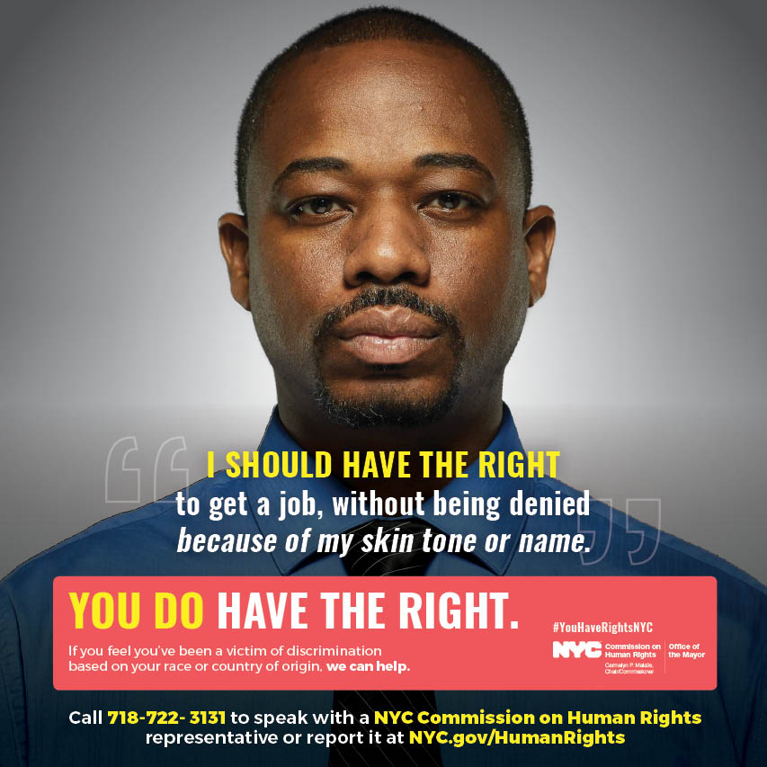 Every New Yorker has the right to live free from discrimination and harassment. The NYC Human Rights Law, enforced by the NYC Commission on Human Rights, is one of the strongest anti-discrimination laws in the country, and protects you from discrimination based on race, color, religion, immigration status, national origin, sexual orientation, gender and gender identity, among other protected categories.