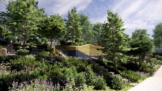 The project will add garden resting areas, climbing paths, group meeting spots, and a wash station. The new outdoor spaces will encompass 20,000 square feet and will be filled with greenery, including 20 plant species, 41 trees, and more than 800 shrubs. The project also includes new landscape irrigation, drainage, storm water management, and outdoor lighting for evening events and security.