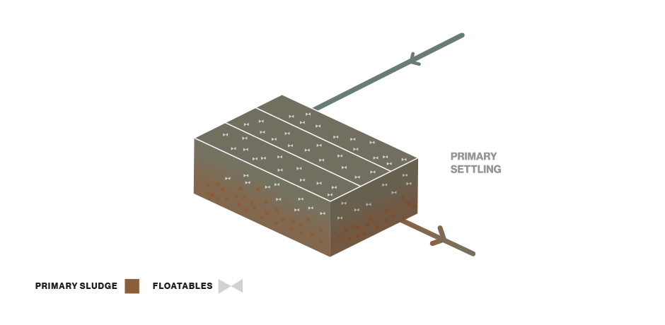 Next, the wastewater enters primary settling tanks where the flow of water slows down. We skim off the lighter solids that float, such as grease and small plastic material from the surface of the tanks. Meanwhile, sludge, or the heavier organic solids (feces, food, and paper fibers), begins to sink. We remove this primary sludge from the bottom of the settling tanks for thickening and digestion.