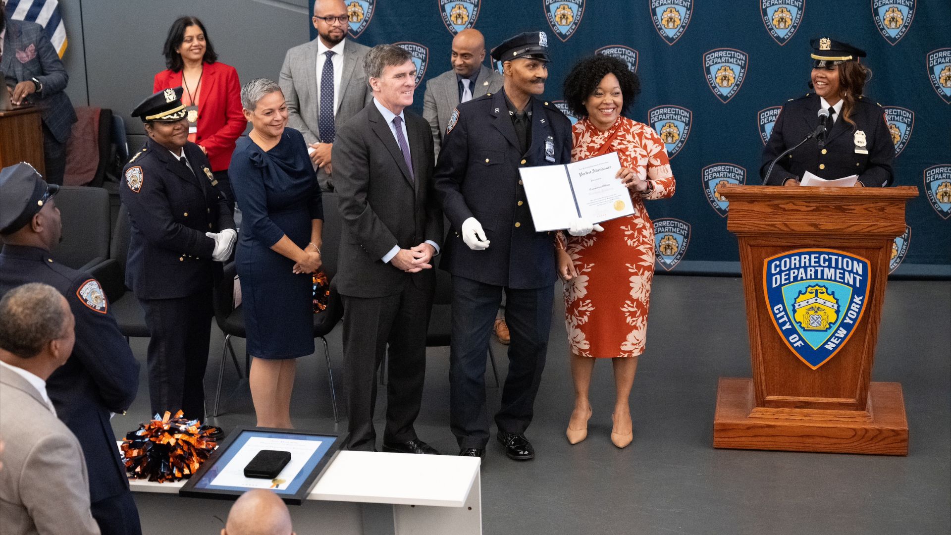 Joined by New York City Deputy Mayor for Public Safety Chauncey Parker, Commissioner Lynelle Maginley-Liddie presented medals to honor staff for their extraordinary display of bravery while working in city jails.