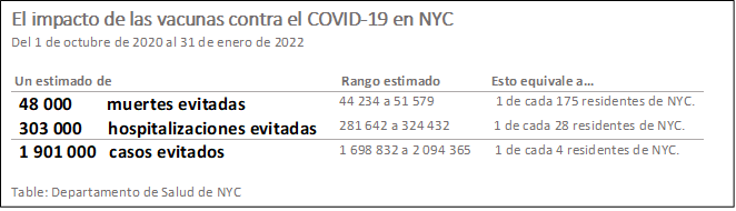 4 de marzo de 2022 — El Departamento de Salud anunció hoy que la histórica campaña de vacunación contra el COVID-19 de la ciudad de Nueva York ha evitado un estimado de 48 000 muertes, 300 000 hospitalizaciones y 1.9 millones de casos desde el inicio de esta campaña en diciembre de 2020, según un análisis realizado por epidemiólogos de la Universidad de Yale con el apoyo del Departamento de Salud y de Commonwealth Fund. Más del 77 % de los neoyorquinos de todas las edades están totalmente vacunados y, hasta la fecha, se han administrado más de 17 millones de dosis de vacunas en la ciudad de Nueva York.