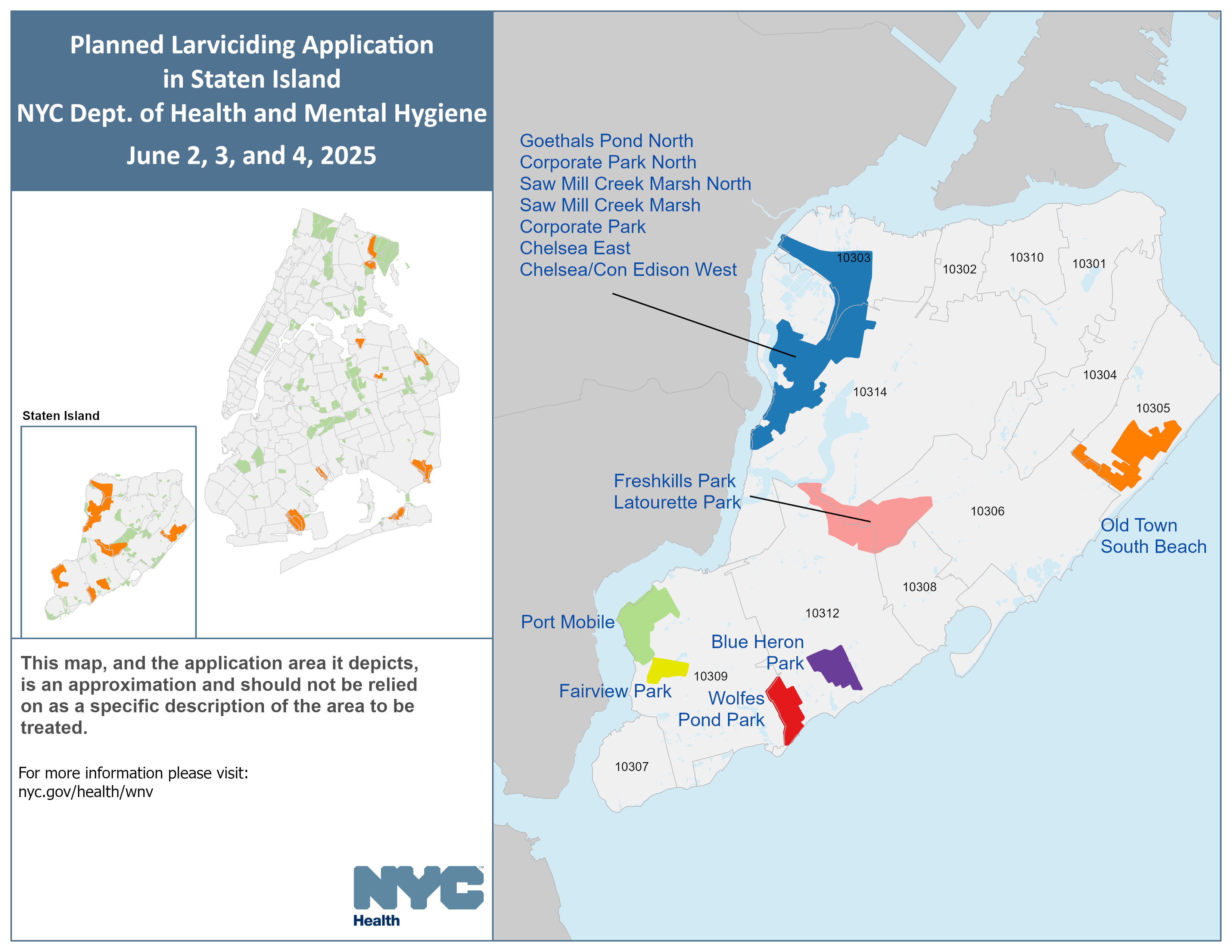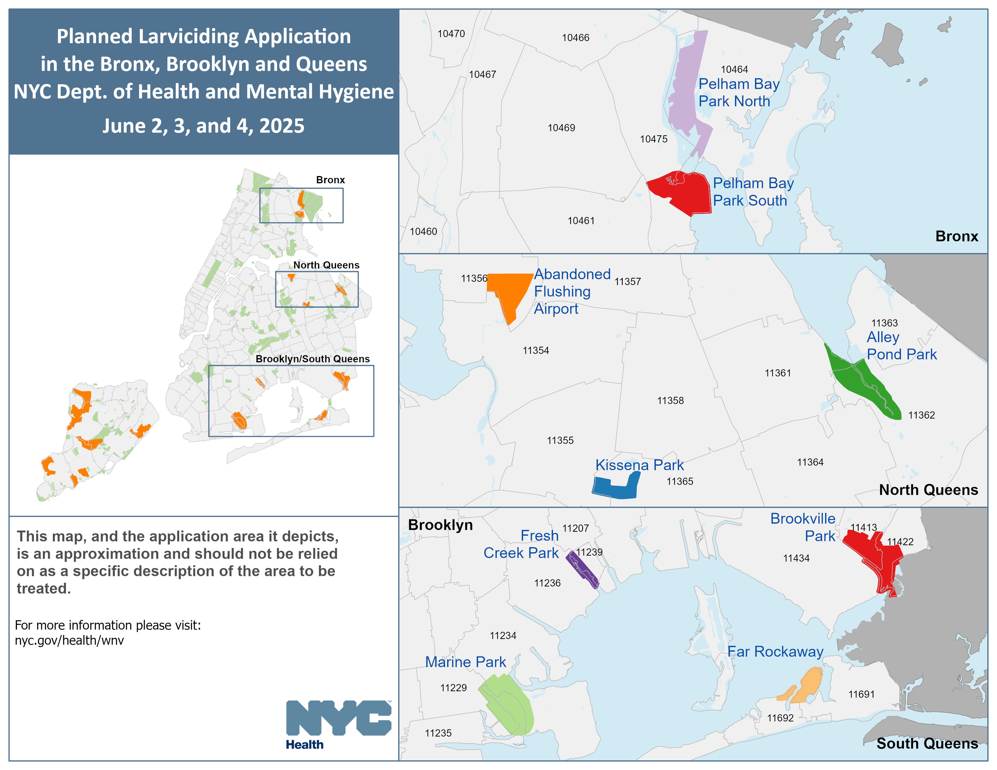 May 30, 2025 — To reduce mosquito activity and the risk of West Nile virus, the New York City Health Department (NYC Health Department) will conduct its first aerial larviciding treatment of the season to marshes and wetland areas of the Bronx, Brooklyn, Queens, and Staten Island on Monday, June 2, Tuesday, June 3, and Wednesday, June 4, 2025, between the hours of 6:00 a.m. and 7:00 p.m., weather permitting. The helicopter will treat only nonresidential areas. In case of bad weather, application will be delayed until Thursday, June 5, Friday, June 6, 2025, and Monday, June 9, 2025 during the same hours, weather permitting.