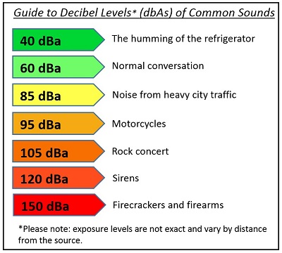 Noise loudness is measured in decibels (dBA). When decibel levels go up a little, loudness goes up a lot. Noise that is 90 decibels sounds twice as loud as noise that is 80 decibels.