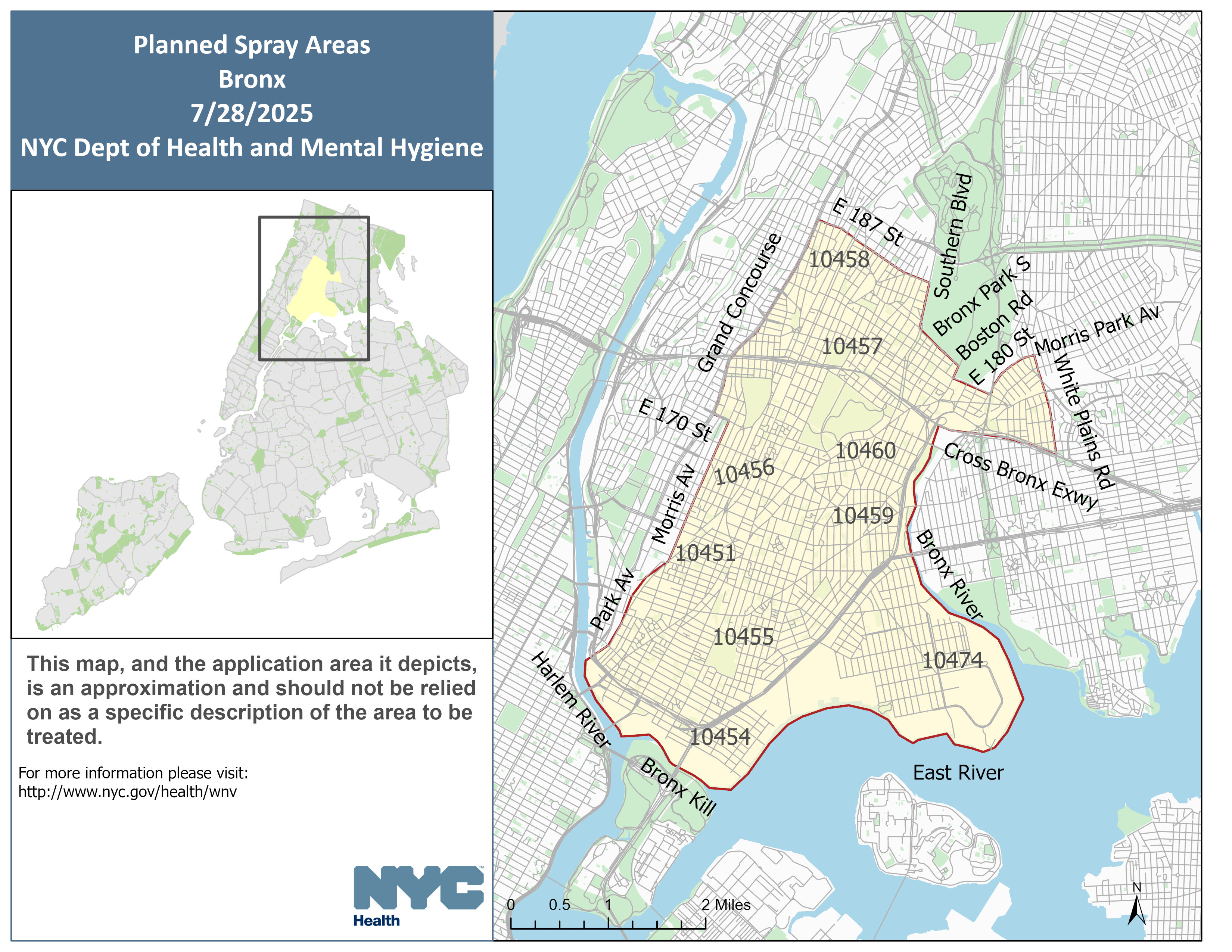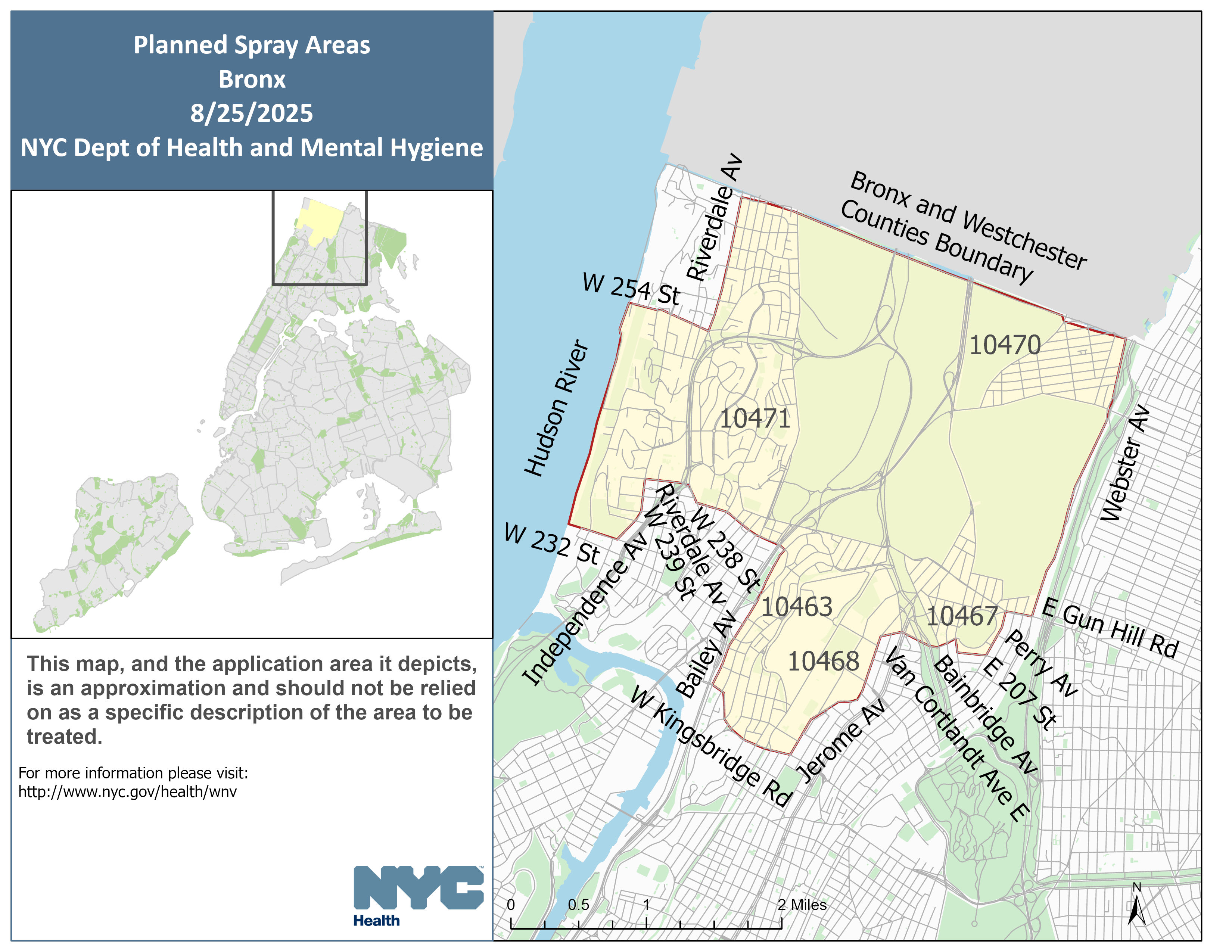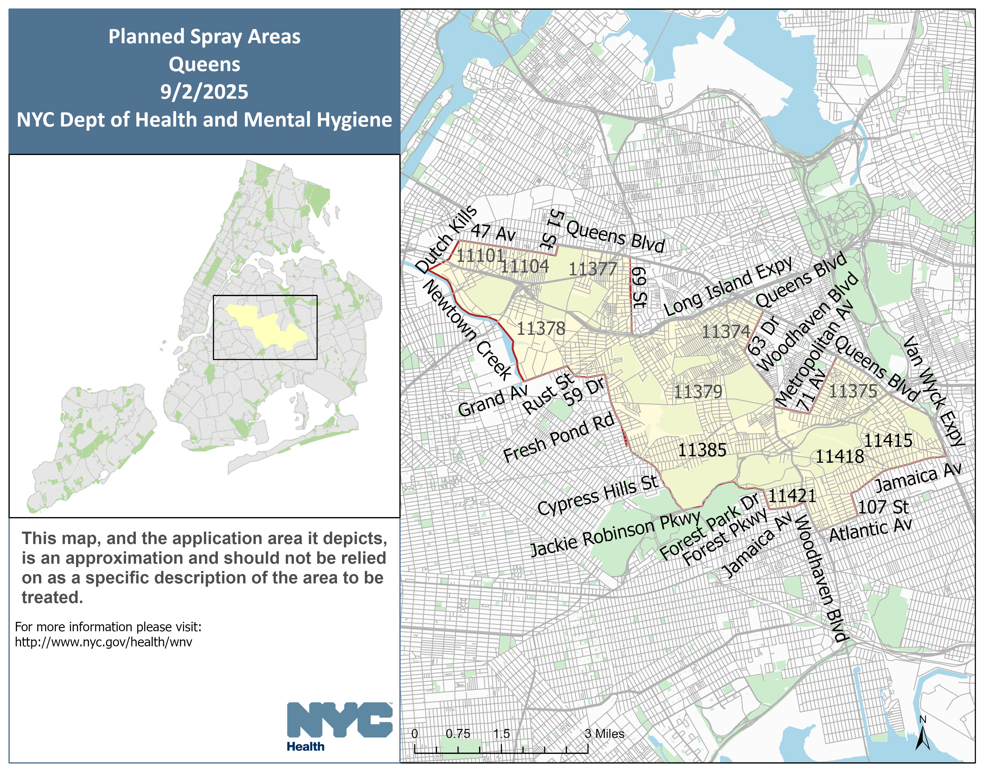 Larvicide products are for use in catch basins and water bodies, while adulticide products are limited for targeted control of adult mosquitoes throughout the five boroughs as needed.