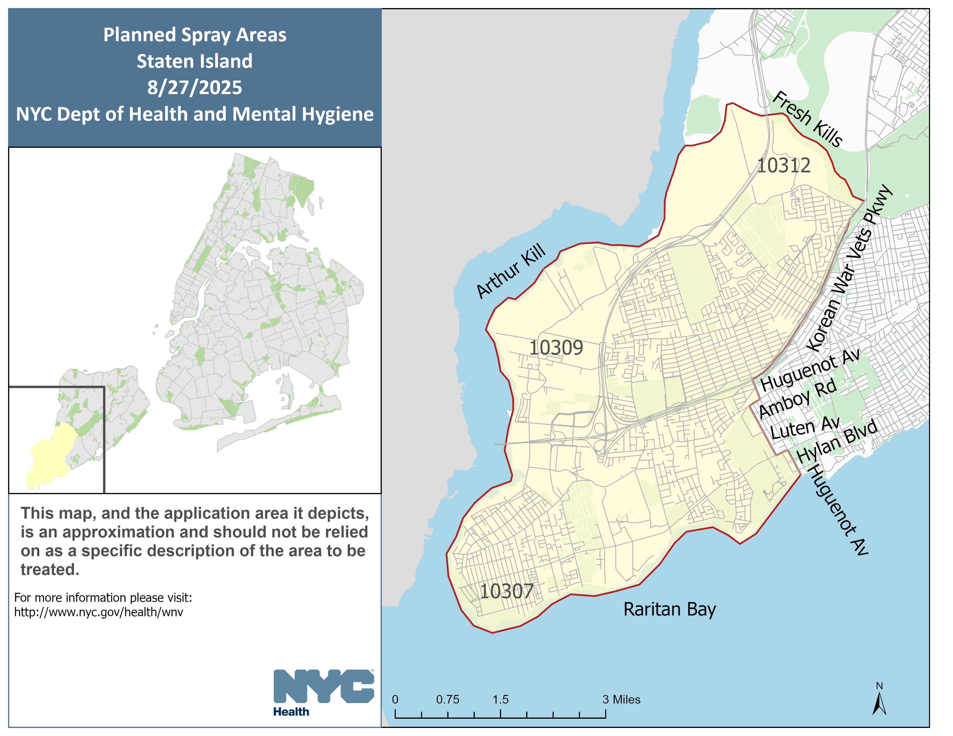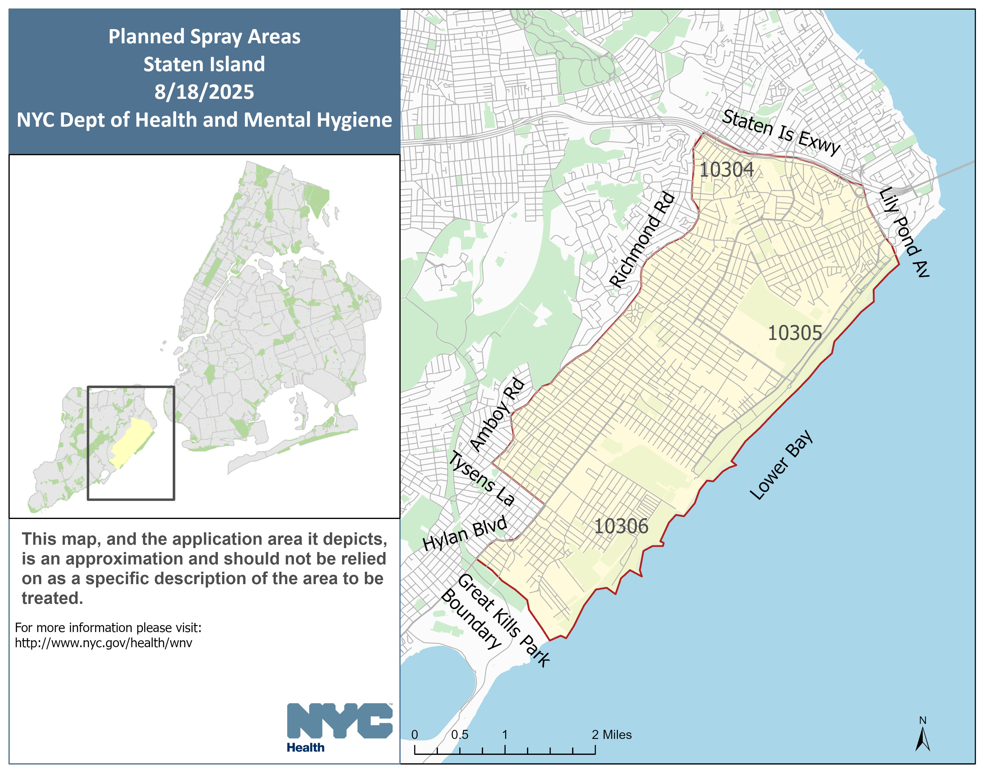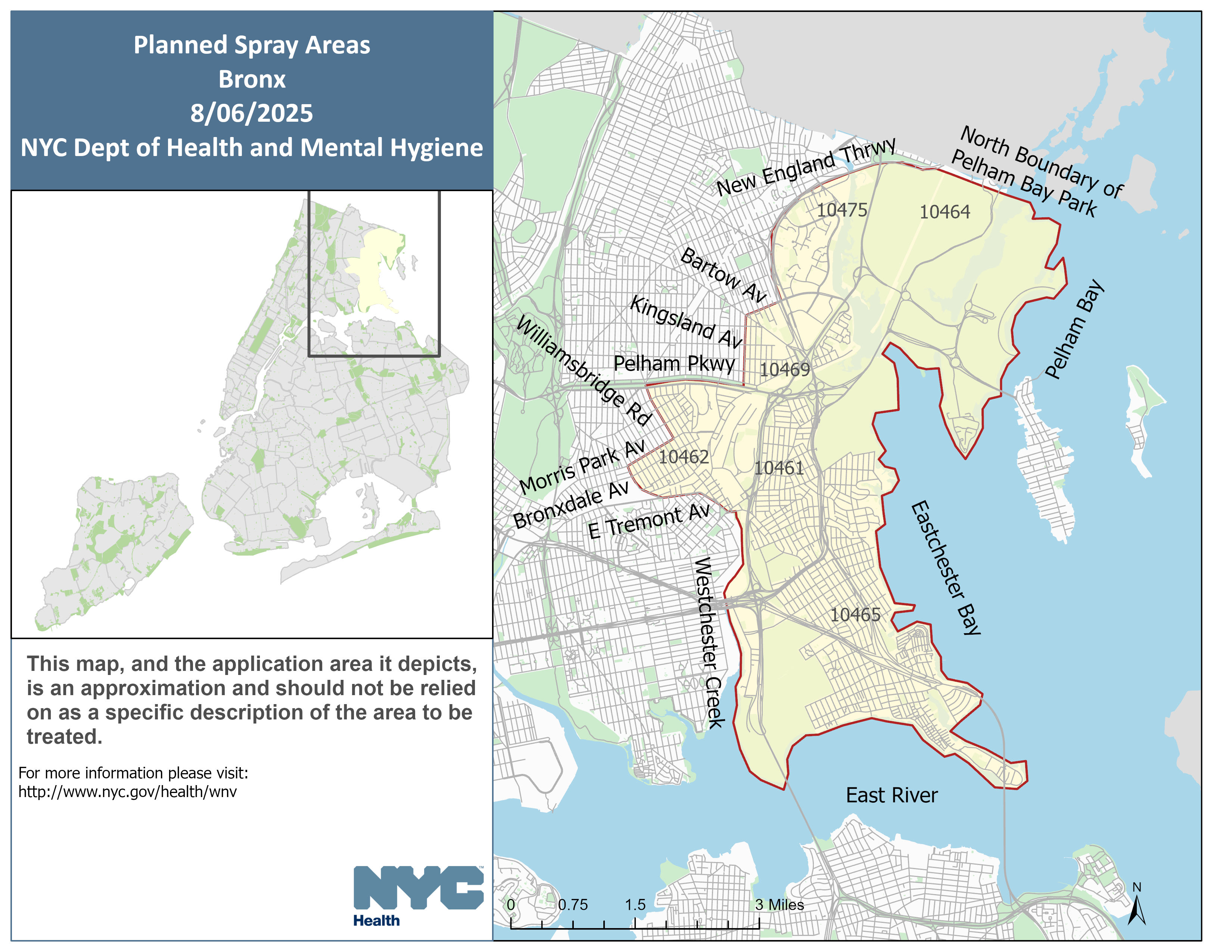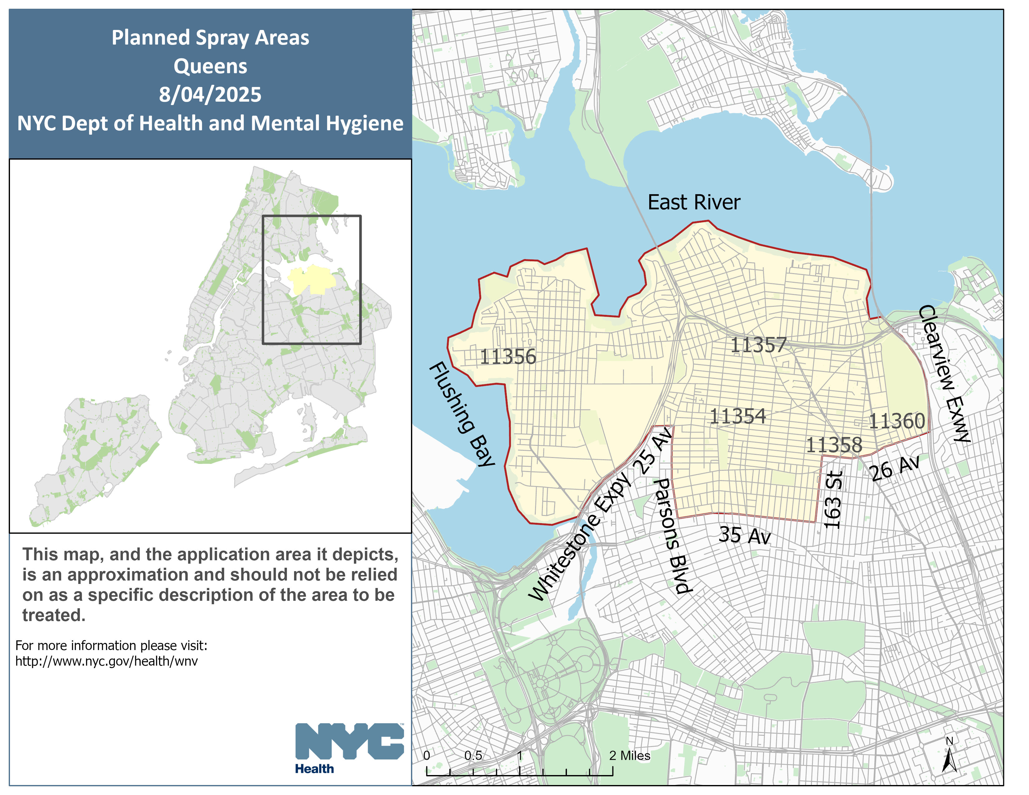 Larvicide products are for use in catch basins and water bodies, while adulticide products are limited for targeted control of adult mosquitoes throughout the five boroughs as needed.