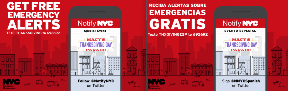 “One of the things we’ll do is activate our short code messaging,” said NYC Emergency Management Director of Public Warning Nick Narine. “Right now, you can text the word ‘thanksgiving’ to the number 692-692 and opt to receive messaging specifically for the Macy’s Thanksgiving Day Parade. That’s really helpful for visitors who may not want to opt-in to Notify NYC long term. Any hazards happening on the parade route, you’ll be the first to know.”