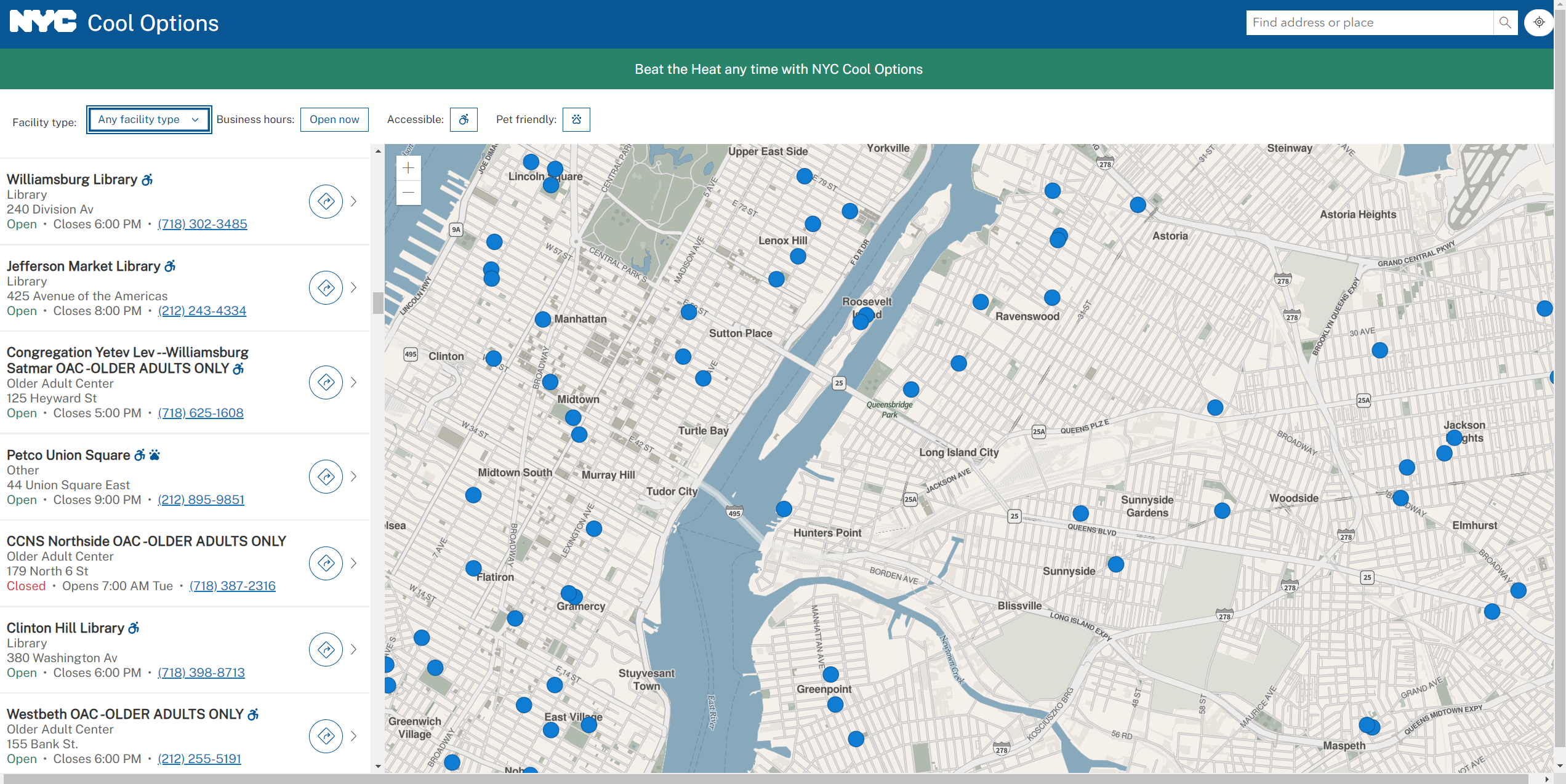 During heat emergencies, the City will open cooling centers throughout the five boroughs. Visit the Cooling Center Finder or call 311 (212-639-9675 for Video Relay Service, or TTY: 212-504-4115) to find out whether a cooling center is open near you.