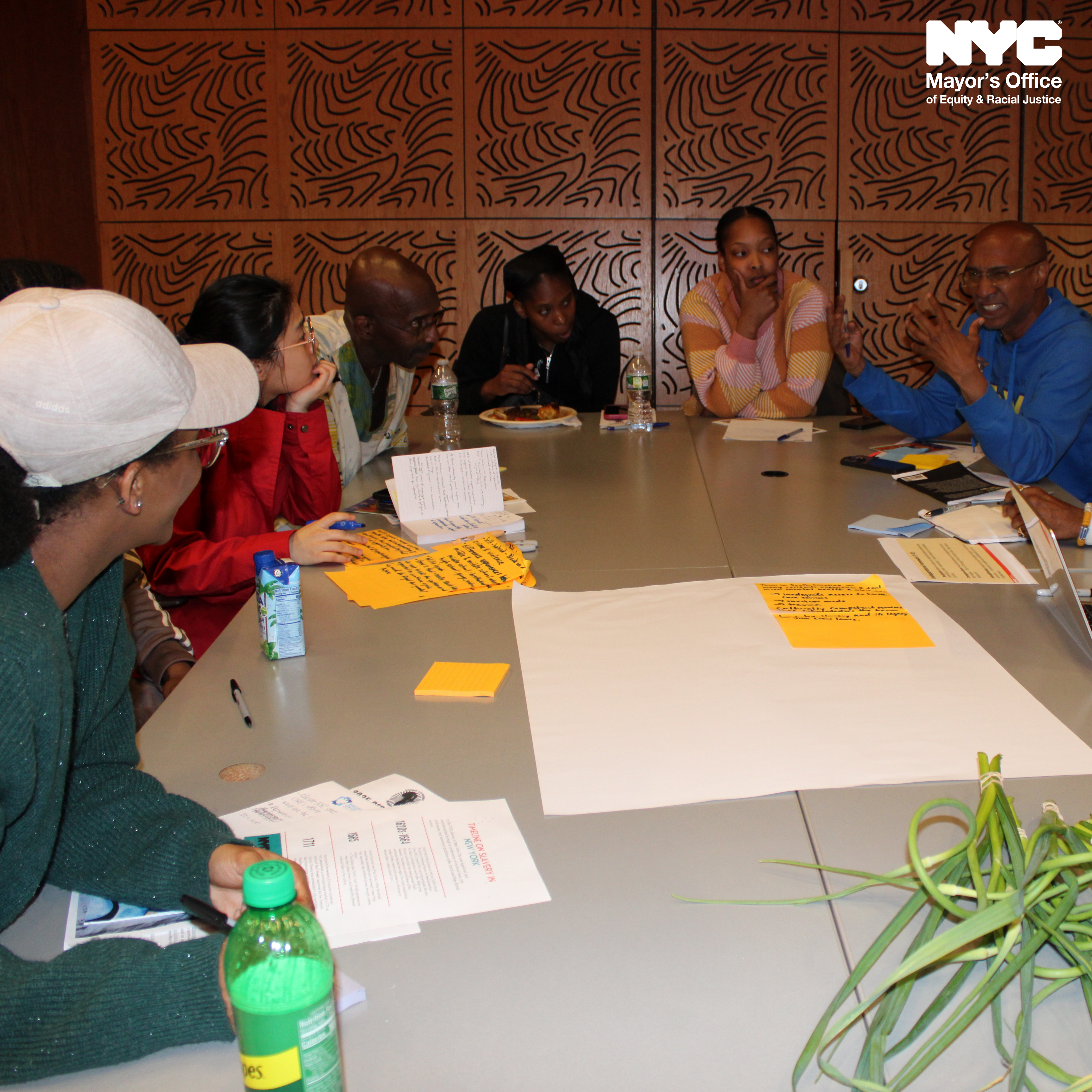 Tuesday, November 28, 2023, the NYC Mayor's Office of Equity & Racial Justice (MOERJ) and the NYC Mayor’s Office of Engagement co-lead a bi-monthly, in-person meeting of citywide engagement/outreach teams for a group exercise on the history of New York. In discussion groups explored equity, root causes of disparities, how to assess crucial data, and how to engage communities with racial awareness.