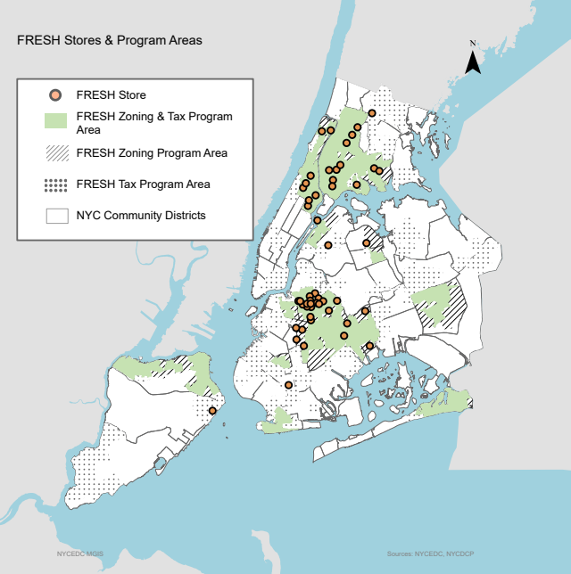 FRESH provides zoning and financial incentives for the establishment and retention of grocery stores. Since 2009, this program has allowed for the opening of 30 FRESH stores within walking distance of 1.2 million previously underserved New Yorkers. There are another 21 FRESH stores in various stages of development that will offer fresh food choices to an additional 300,000 New Yorkers in underserved communities.