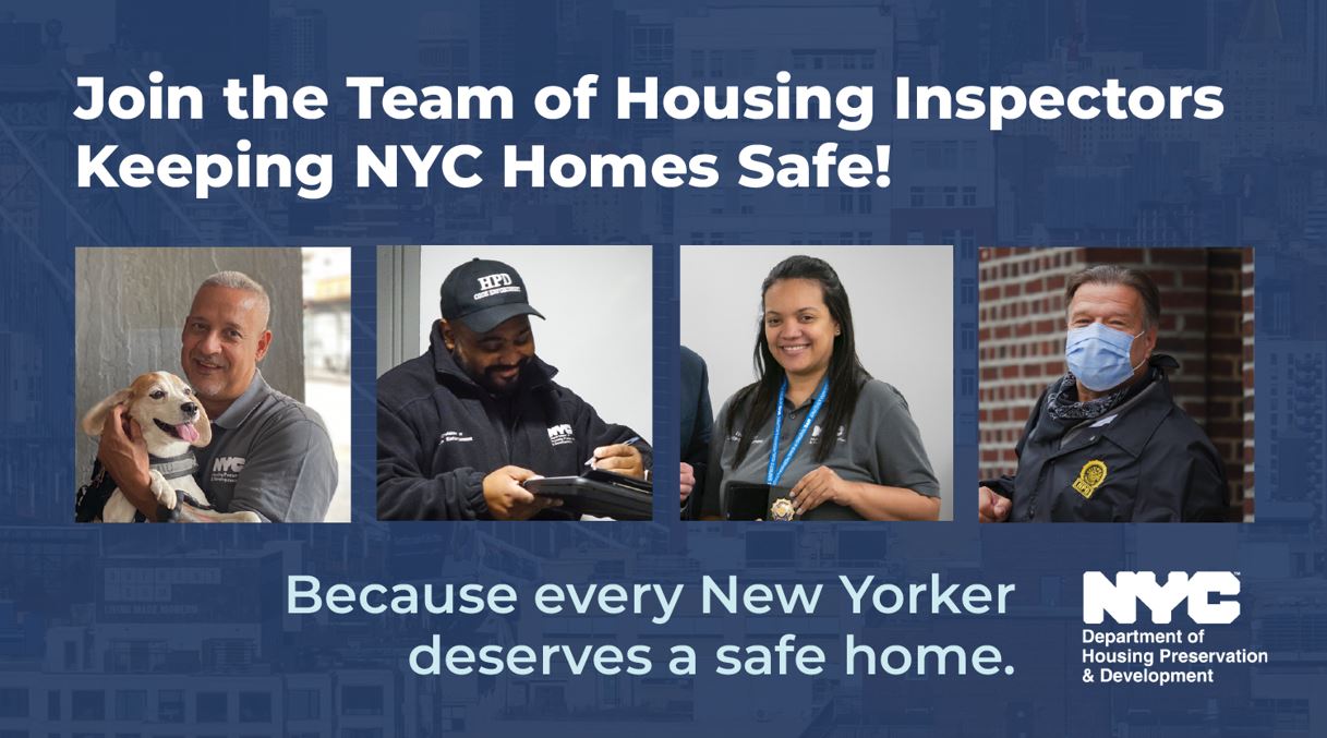 Every New Yorker deserves a safe home. Become a Housing Inspector to make sure families have heat and hot water, kids are safe from lead-based paint, and fire safety protections like smoke detectors are present to save lives. Join our diverse team inspecting homes across the city to keep New Yorkers safe.