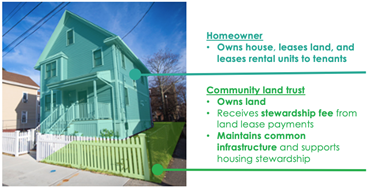A Community Land Trust (CLT) essentially separates the ownership of the land from the ownership of the structures on that land. CLTs operate as a non-profit entities that own multiple parcels of land and lease that land to potential homeowners, who can buy and own the structures on the CLT. This model allows for long-term housing affordability and local control of land.