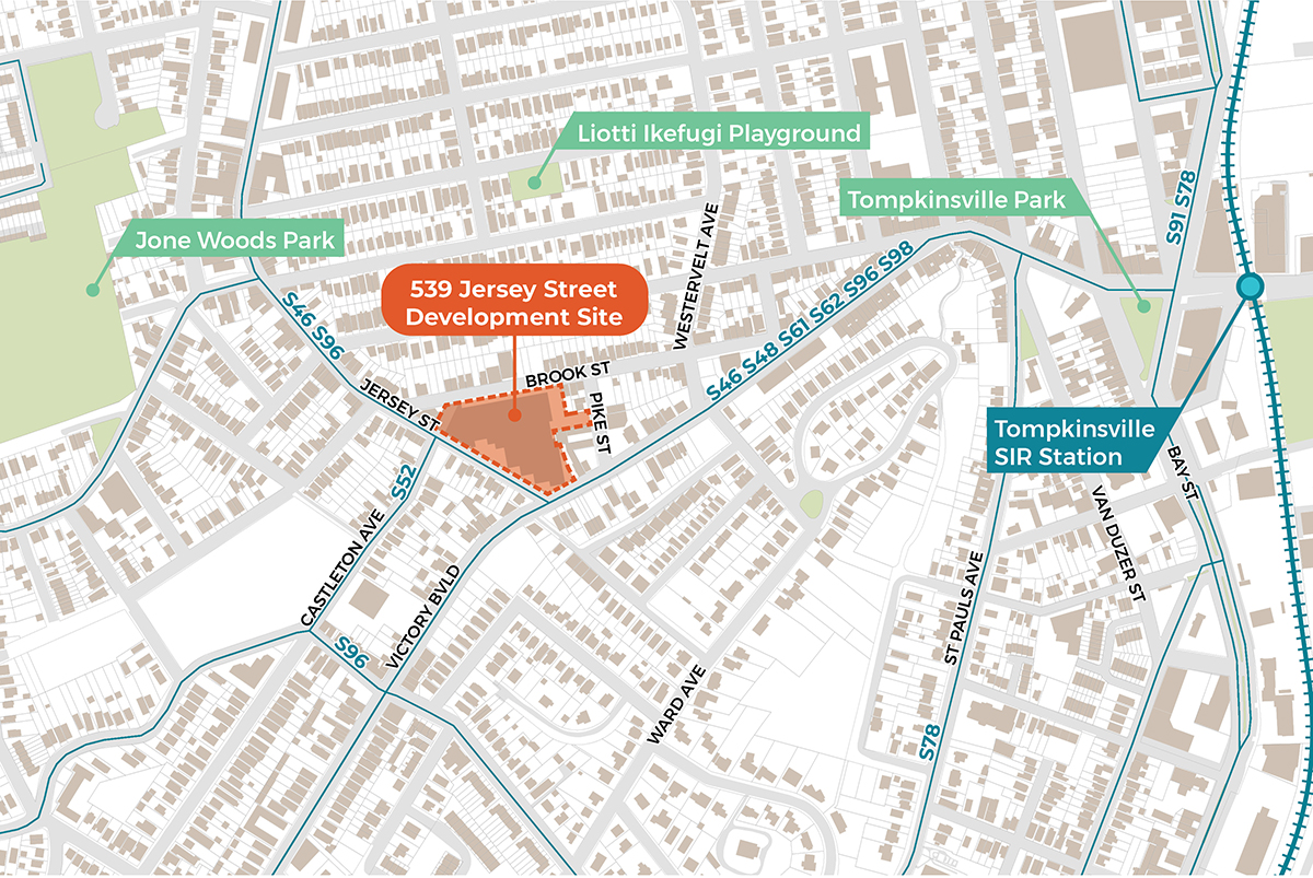 The Site is located on an irregularly shaped block populated with one- and two-family homes, a local business, and the Mount Sinai United Christian Church. The Site is surrounded by a mix of uses ranging from one-family homes to small apartment buildings, religious institutions, and local businesses. Jersey Street and Victory Boulevard are commercial corridors with neighborhood-serving retail and community facility uses. The Site is directly served by the S46, S48, S61, S62 and S66 buses on Victory Boulevard, and the S52 bus on Jersey Street, and is approximately one-half mile from the Tompkinsville Staten Island Railroad (SIR) station and one mile from the St. George Ferry Terminal.