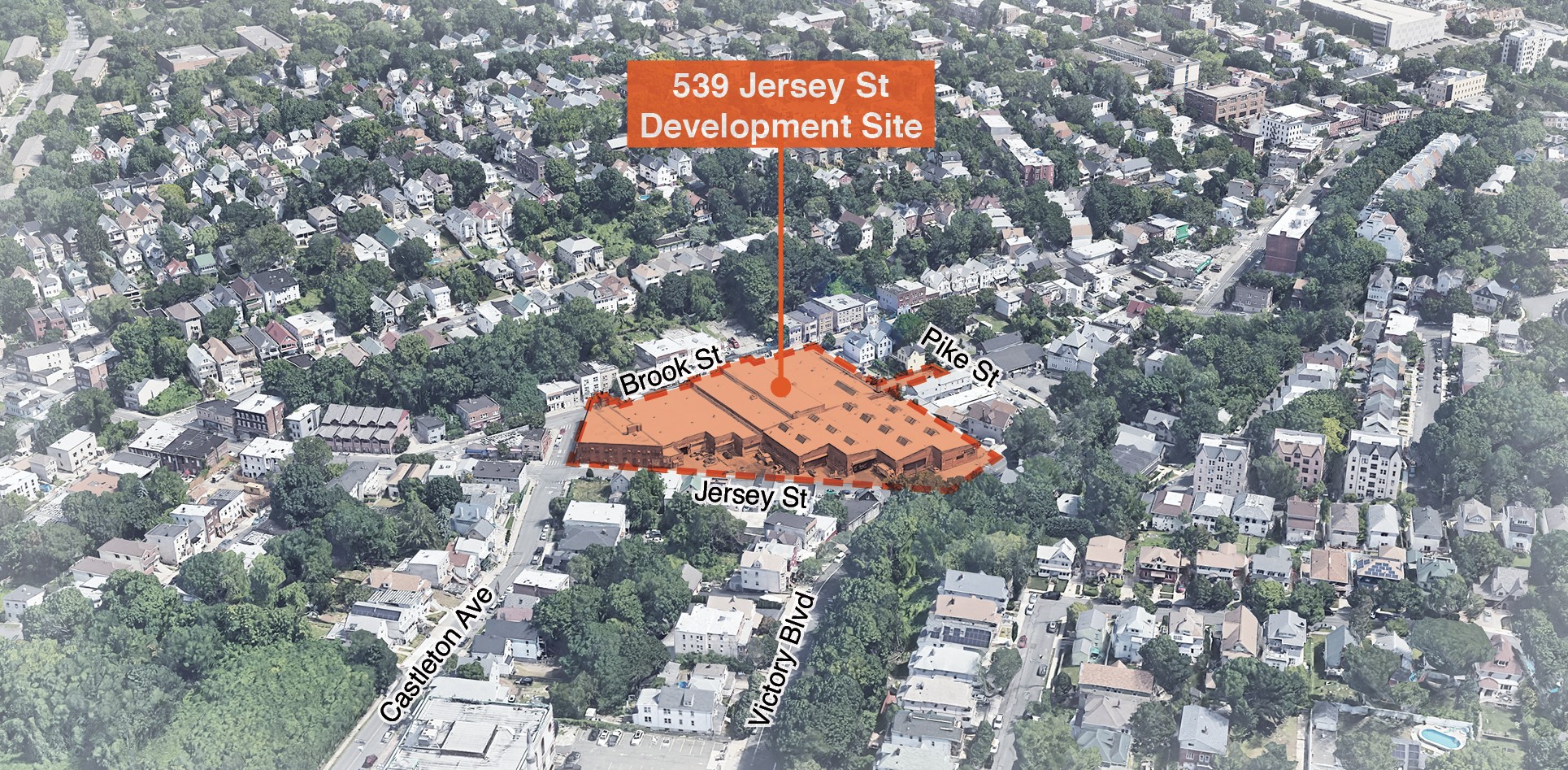 The Jersey Street Site fronts Brook Street, Castleton Avenue, Jersey Street, Victory Boulevard and Pike Street on Staten Island’s North Shore. The site sits between the neighborhoods of St. George, New Brighton, and Tompkinsville. The Site is approximately 115,000 SF and currently operates as a Department of Sanitation (DSNY) garage. The Staten Island District 1 Sanitation Garage is an active facility that provides vital cleaning, collection and snow removal services to residents of Staten Island Community District 1. The NYC Department of Design and Construction (DDC) is currently constructing a new Staten Island 1 garage, which is scheduled to be completed by the end of 2024. DSNY expects to relocate operations from Jersey Street to that facility once it is completed.