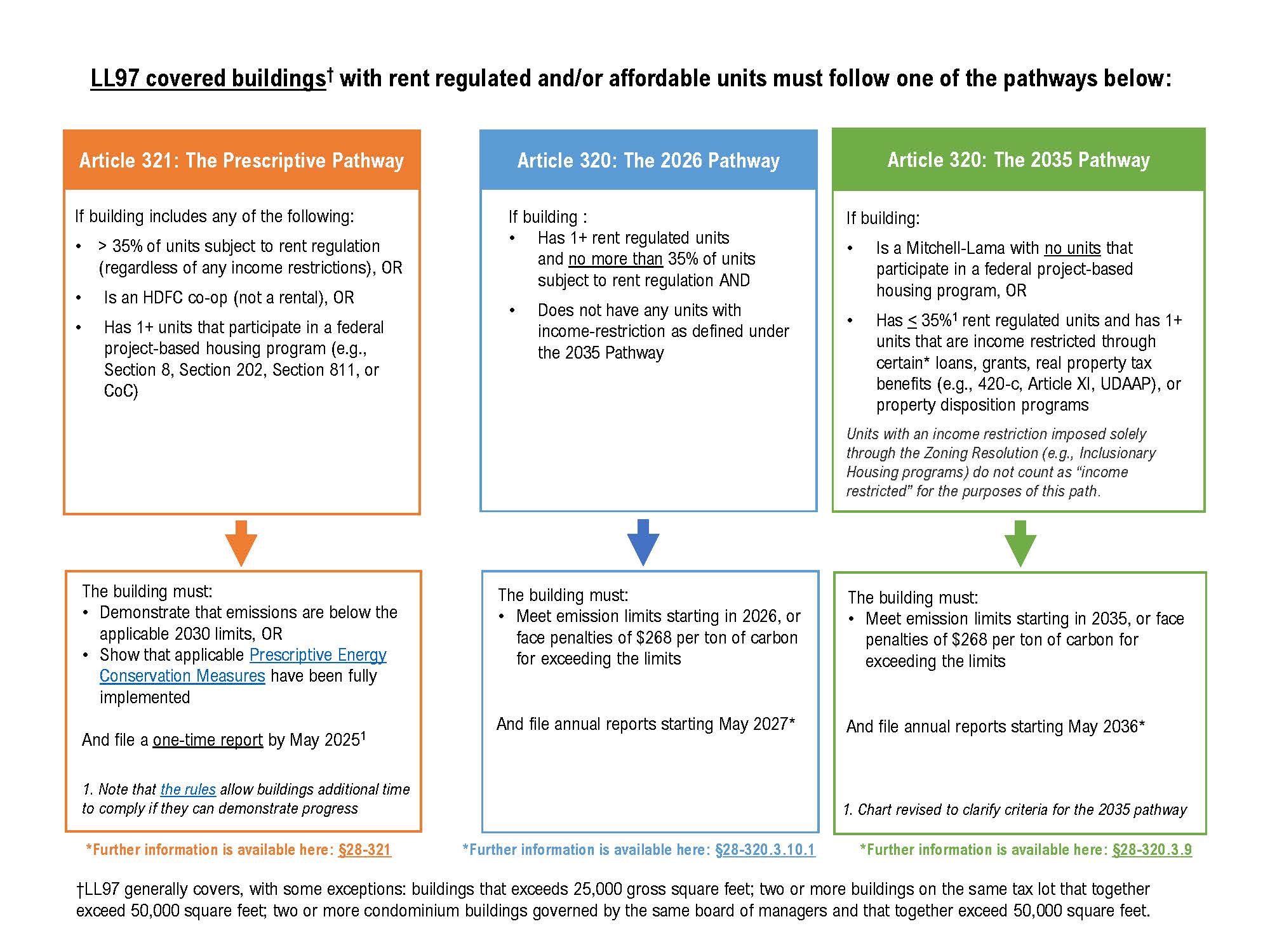 New York City’s one million buildings account for nearly two-thirds of the city’s carbon emissions. The Climate Mobilization Act of 2019 included Local Law 97 (LL97), which sets increasingly stringent caps on greenhouse gas emissions from most buildings over 25,000 SF starting in 2024. While buildings that contain affordable and rent-regulated housing are treated somewhat differently (see graphic below), the first compliance report for many of these buildings is due in 2025. This webpage focuses on Article 321 since most HPD projects fall under this category.