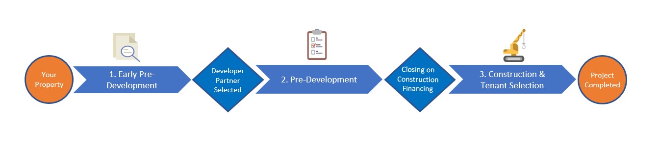 Early Pre-Development (1-2 years): In this first stage, you will work with your Owner’s Representative (i.e., your project manager) to develop a vision for your property, conduct a preliminary assessment of your property, gather community feedback on your plans, and pull together “pre-development” funding to cover early-stage costs of the project. A key step in this process is the selection of a developer for your affordable housing project. It is important that the developer you select has prior experience working with HPD on developing affordable housing and understands the City’s land use and development processes. Your Owner’s Representative will help you put out and evaluate responses from a Request for Proposals (RFP), which invites developers to submit proposals for projects that meet your vision. Once you have selected a developer, your attorney will help you negotiate and execute the partnership agreement.