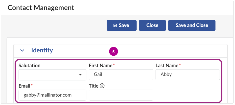 - Enter the new contact's First Name, Last Name, and Email Address in the Identity section.