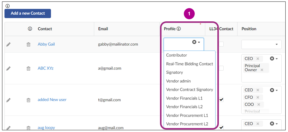 Newly added contacts appear in a table below the Add a new Contact button. Each contact must be assigned at least one user role in the Profile column of this table. Multiple roles can be assigned to a single user. There is no limit to the number of roles a user can be assigned.