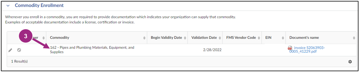 - If your listed commodity codes no longer reflect what your business does or can do, click the pencil icon to access the commodity enrollment and click the Delete button.