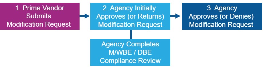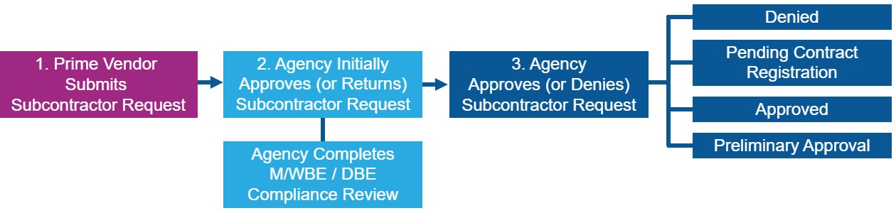 - Agency Initial Approval: The agency reviews the request. For contracts with M/WBE goals, the agency reviews the subcontractor's NYC M/WBE certifications.