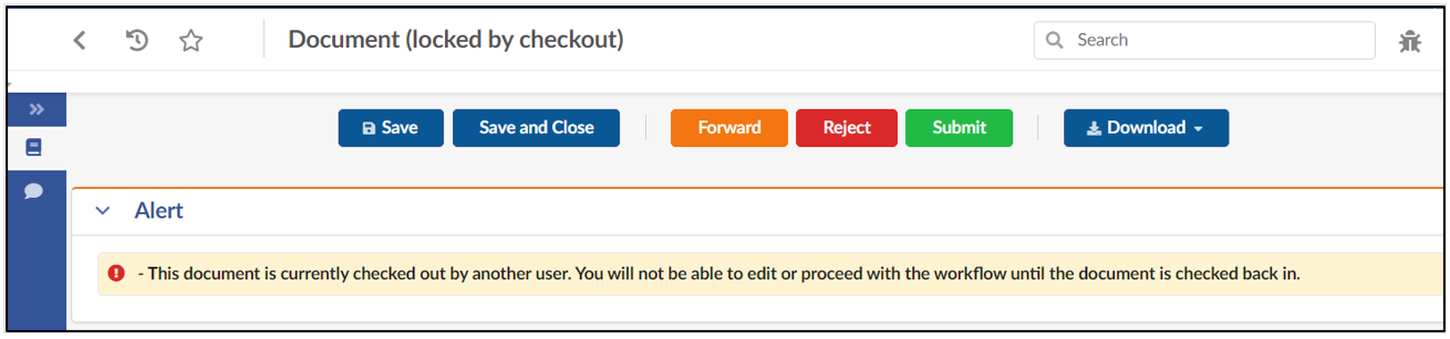 - The Alerts section contains a red blocking alert: "This document is currently checked out by another user. You will be unable to edit or proceed with the workflow until the document is checked back in."