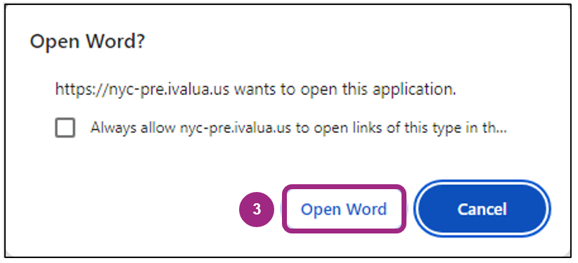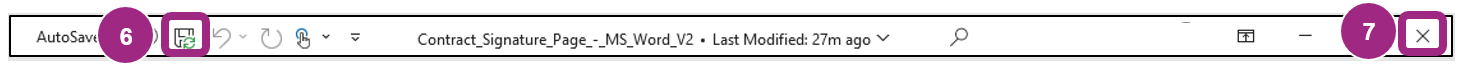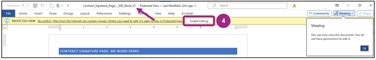 Click the Open Word button to open the document in your computer's Microsoft Word application.   The document opens in read-only mode. The document file name automatically includes the authoring Document Name + the Version you are viewing. In this example, we are viewing version 2 of the document, so the file name is "Contract Signature Page - MS Word V2".