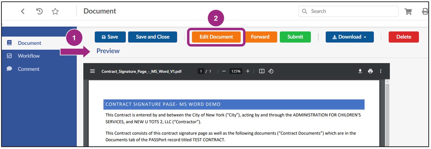 Scroll down to the Preview section to view the previously uploaded document. Documents in MS Word can only be viewed and cannot be edited within PASSPort.