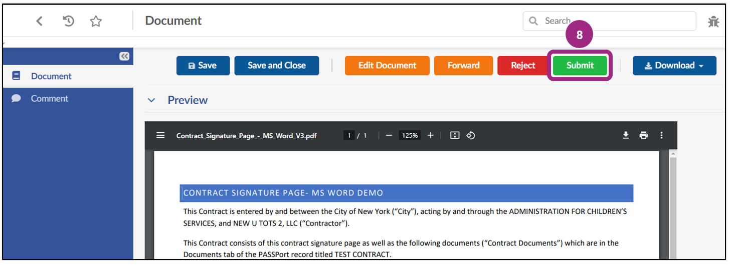 Scroll down to review the Contract Signature Page. At this point, the document is read-only and cannot be edited. Note: To review the Signature Page in PDF or Word format, click the PDF icon or Word icon in the Import/Export section. If the document was created using MS Word, a Download button is visible near the top of the page.