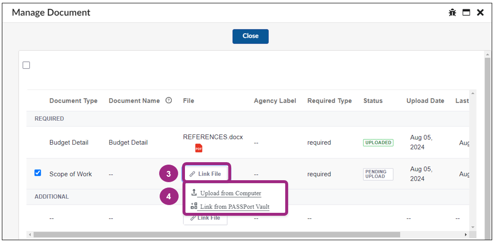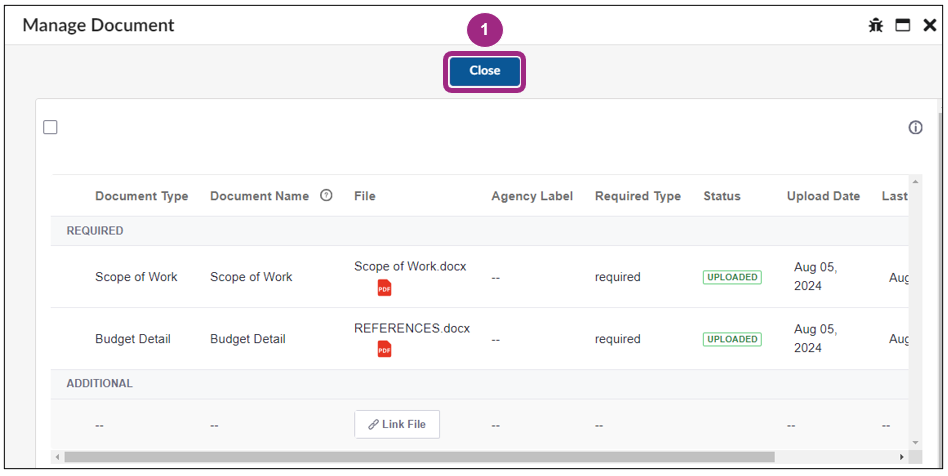 - Once the document is added, you can upload or link additional files or click the Close button to return to the Documents screen.