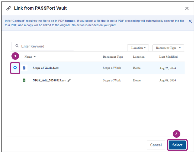 Click the Select button at the bottom of the screen.   The pop-up closes and the newly linked document appears on the Manage Documents screen. Note: If a non-PDF document is uploaded or linked from the Vault, the document is automatically converted to PDF and a copy will be linked to the original.