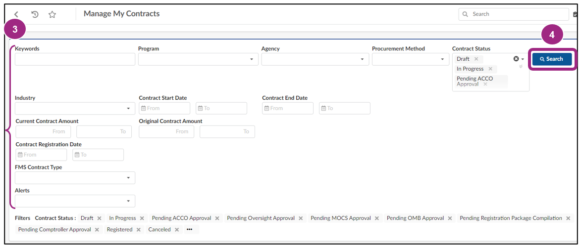 Tip: If known, entering the Contract ID or EPIN into the Keywords field is the simplest way to locate your contract. Alternatively, you can try searching for contracts in “In Progress” status.