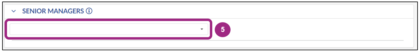 Scroll down to the Senior Managers section. Click into the unlabeled drop-down field to select a Senior Manager. Note: At least one Senior Manager must be selected.