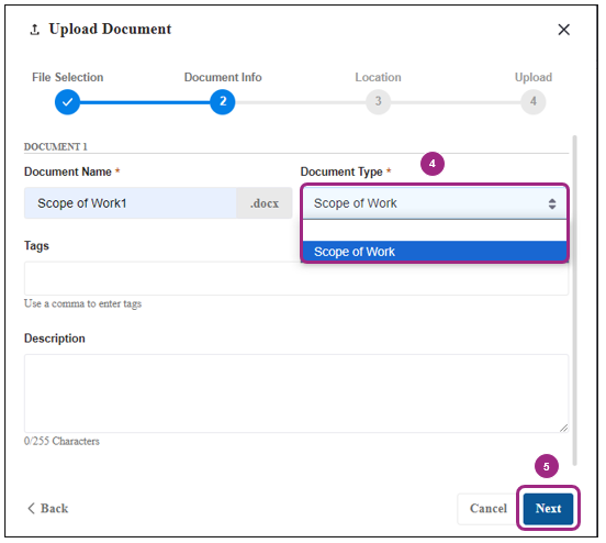 Select the Document Type from the drop-down field. Note: For requested documents, only the requested Document Type will be available in the Document Type field.