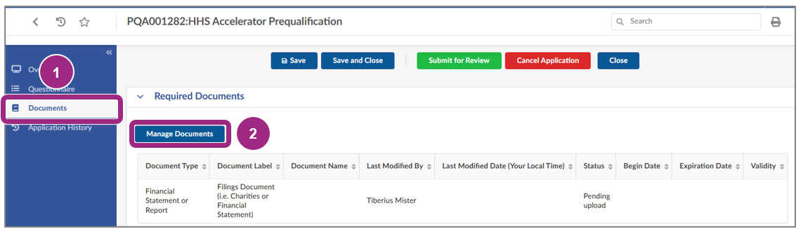 - Click the Documents tab in the left navigation to view the Required Documents section. The Required Documents table displays with the Document Type (Financial Statement or Report), its Document Label and the Status which is currently Pending Upload.