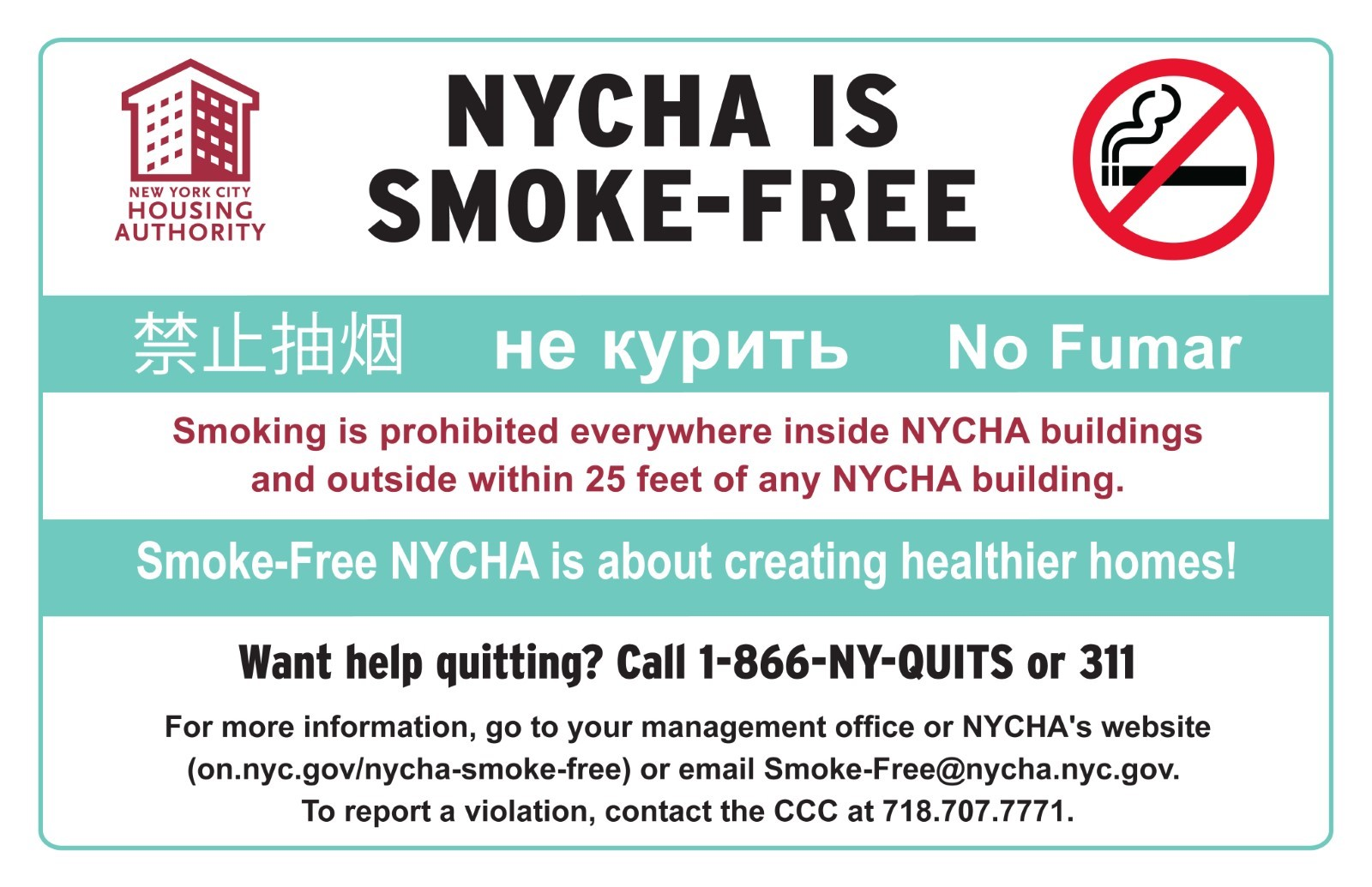 NYCHA’s smoke-free initiative, Smoke-Free NYCHA, promotes healthier homes for residents and healthier working environments for employees by reducing exposure to secondhand smoke and providing support to residents and employees who smoke and want to quit or cut back.