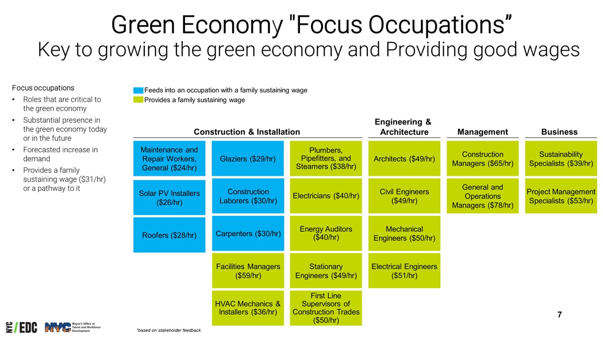 The Action Plan, developed by NYC Talent and the NYC Economic Development Corporation, defines ways to grow the city’s green economy — the jobs and activities that help us reduce and protect against climate change — and train and position New Yorkers, particularly those from environmentally-disadvantaged communities, to benefit from the nearly 400,000 projected green economy jobs by 2040.
